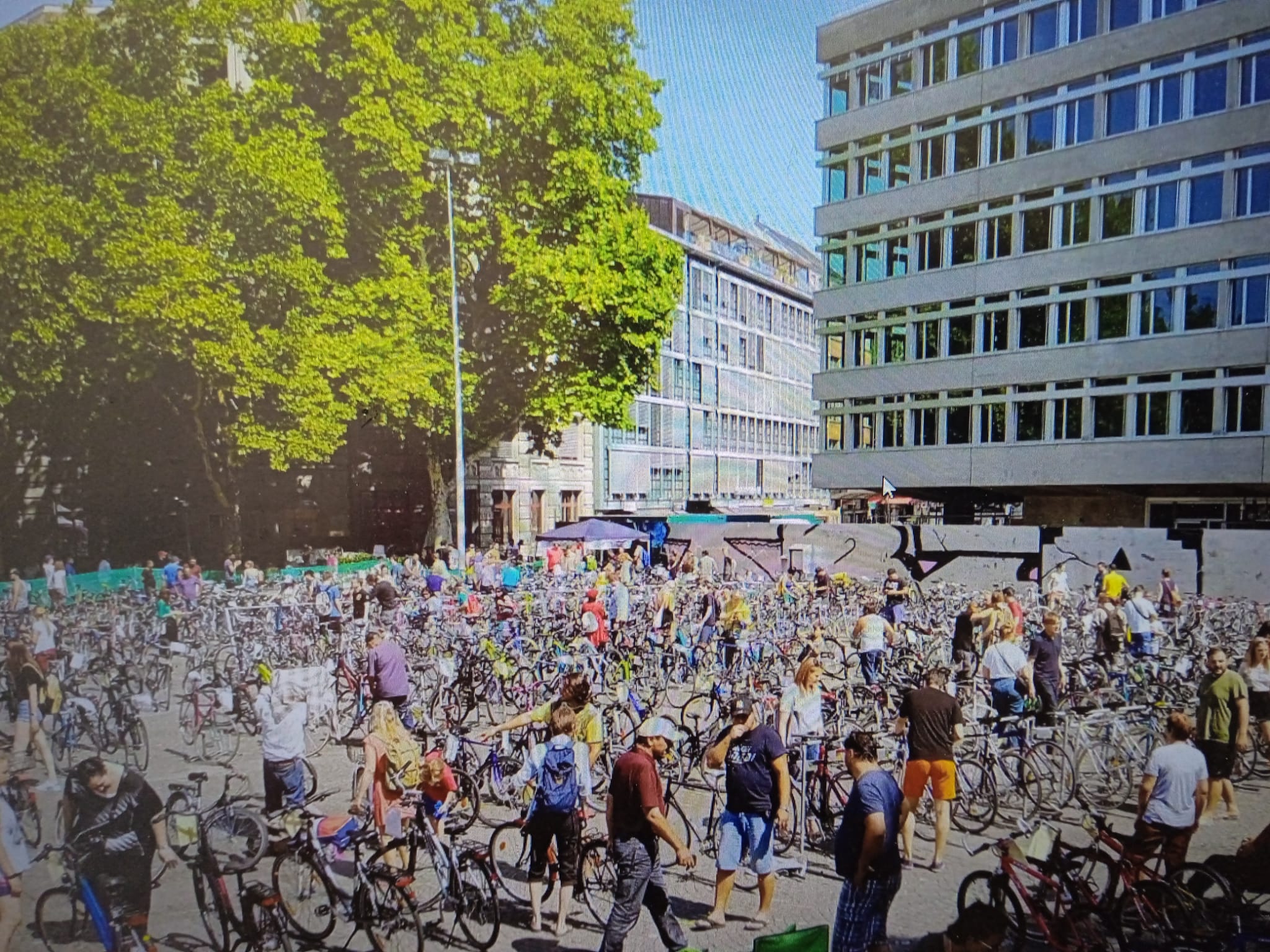 Обычно это открытая площадка или крытое помещение, десятки или сотни велосипедов выстроены в ряды. Есть волонтёры, которые помогают с оформлением.